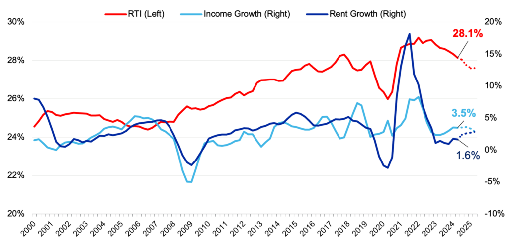 Affordability in housing cannot be adequately measured by rent-to-income (RTI) ratios alone because these ratios remain remarkably stable across different geographies and time periods due to compensatory behaviors by households.