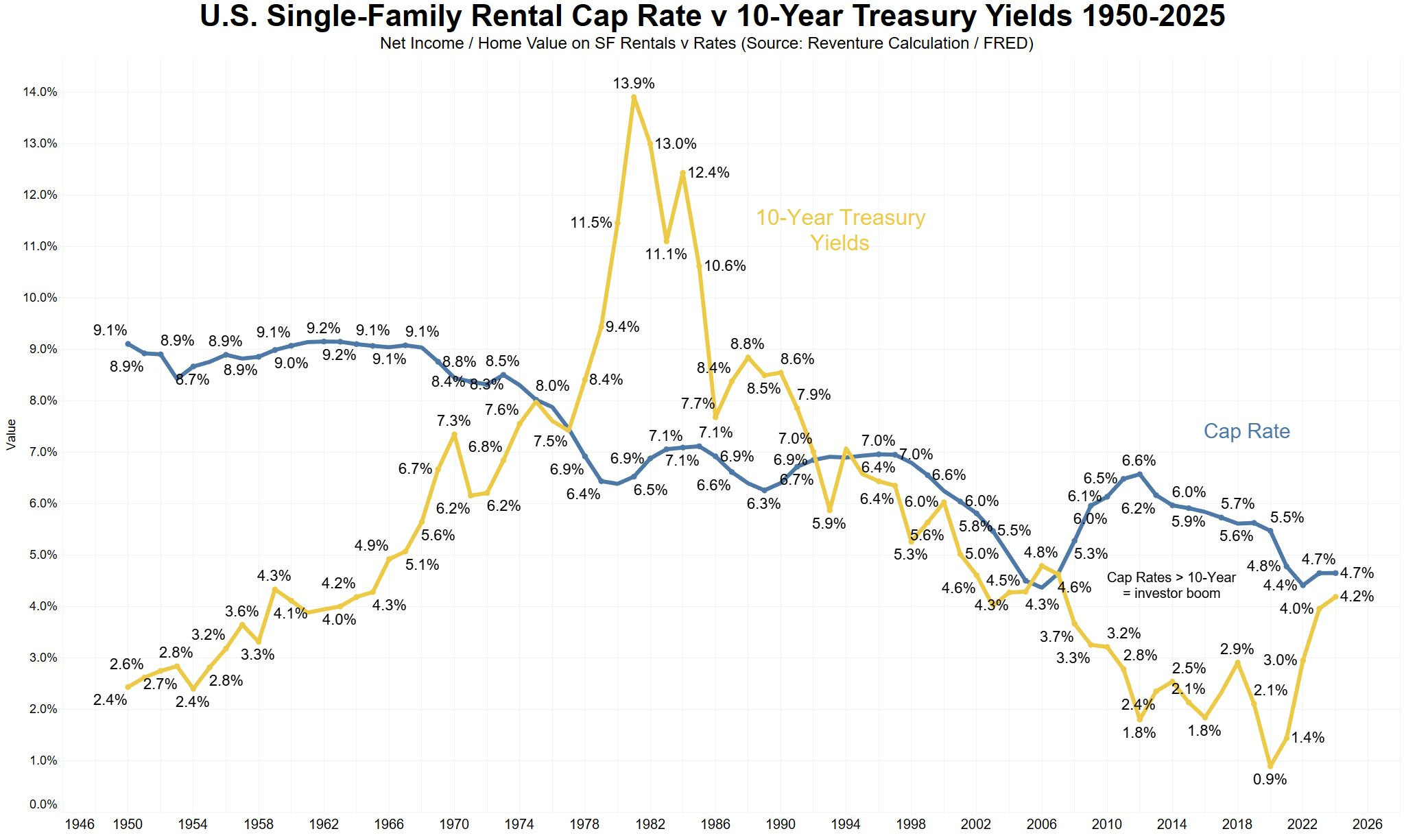 Similarly, in a rational, well-functioning housing market, rents reflect the true demand for housing services while prices merely capitalize that demand. When a developer builds an apartment and can rent it for $2k/month, a 5% cap rate implies a unit value of $480k — mechanically, not optionally. This relationship holds because investors compare real estate returns to alternatives. If they can earn 5% from rental income on real estate or the same 5% from Treasury bonds, the latter looks far more attractive. However, if cap rates offer a premium for the risks of investing in real estate — capital-intensity, cyclicality, illiquidity, etc. — capital redeploys up the risk ladder.
