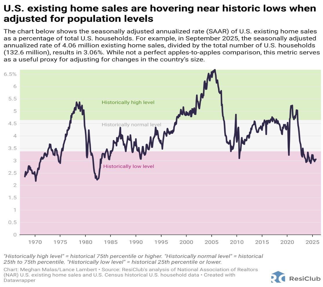With new mortgages pricing in the mid‑6s, the cost of trading up or moving sideways is prohibitive, so existing‑home sales and overall transaction volumes have fallen to multi‑year lows even as national home prices have been roughly flat or slightly rising. Homes linger on market 5–7 days longer than a year ago yet prices remain sticky. This is not a healthy, well‑cleared equilibrium; it is a low‑mobility, high‑price regime where stalled existing home sales have rendered price discovery impaired: