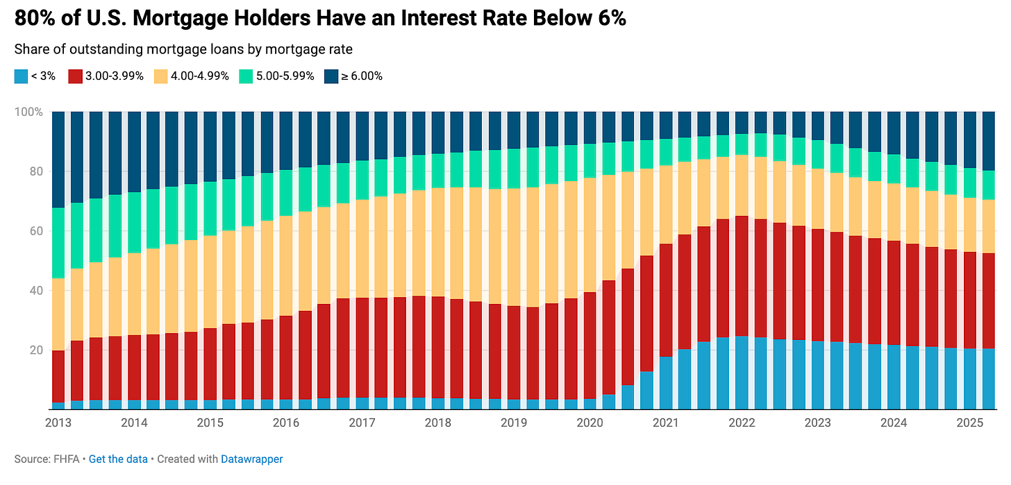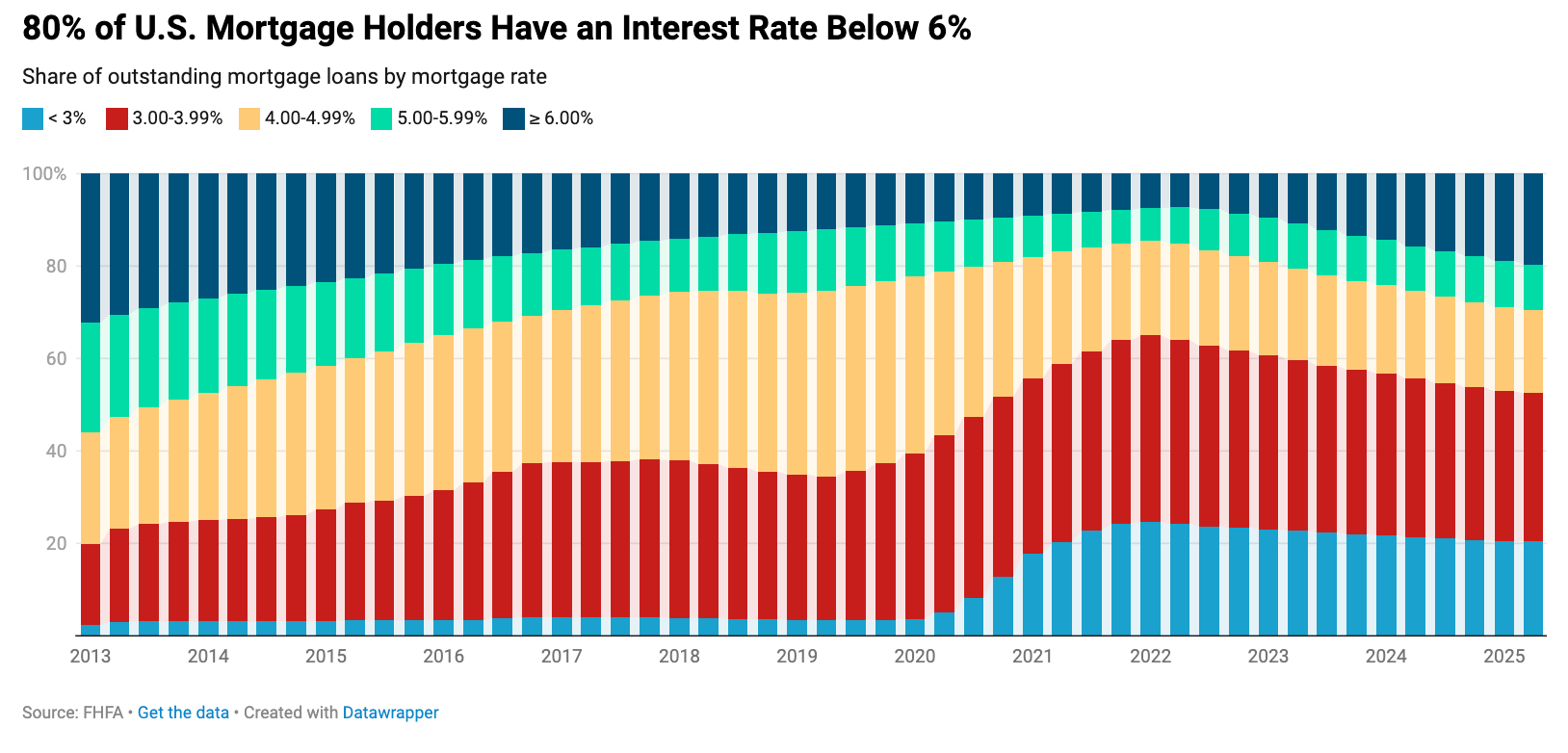 The “mortgage lock‑in” or “golden handcuffs” effect is now a defining feature of the market: just over half of mortgaged homeowners still carry rates below 4%, and more than 80% are still below 6%.