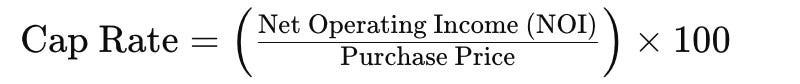 The fundamental equation of real estate finance is the following: property value equals annual net operating income divided by the capitalization (cap) rate. Therefore the formula for calculating the cap rate itself is: