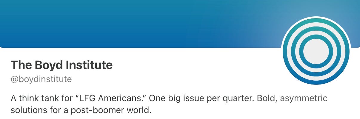 , who’s joining us for a few months and possibly longer. Peter recently stepped away from a PhD program at Stanford Graduate School of Business. He’s in his late 20s, married, and based in Northern Virginia. We met on Substack and noticed some common threads: similar political sensibilities, Stanford ties, and Mormon upbringings. He’s proving to be a valuable thought partner and collaborator. Think of us as an experimental Gen X-Zoomer alliance.With Peter’s help, we’re sharpening the institute’s focus. Rather than playing an inside game in Washington, we’re building a community of “LFG Americans” and like-minded people abroad — people eager to solve problems that matter. Second, we are orienting around building a post-boomer world shaped by technology and generational turnover. Third, we’re doubling down on our unique sprint methodology, focusing on one issue at a time every three or four months. We want to make them more pointed and easier to follow — part Oprah’s book club, part spicy perspectives, part policy lab.