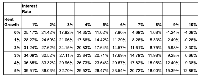 Each cell in the table below returns an IRR given the corresponding interest rate (top row) and rent growth (first column). The IRR includes all cash flows, including the final cash flow which is the sale of the building.