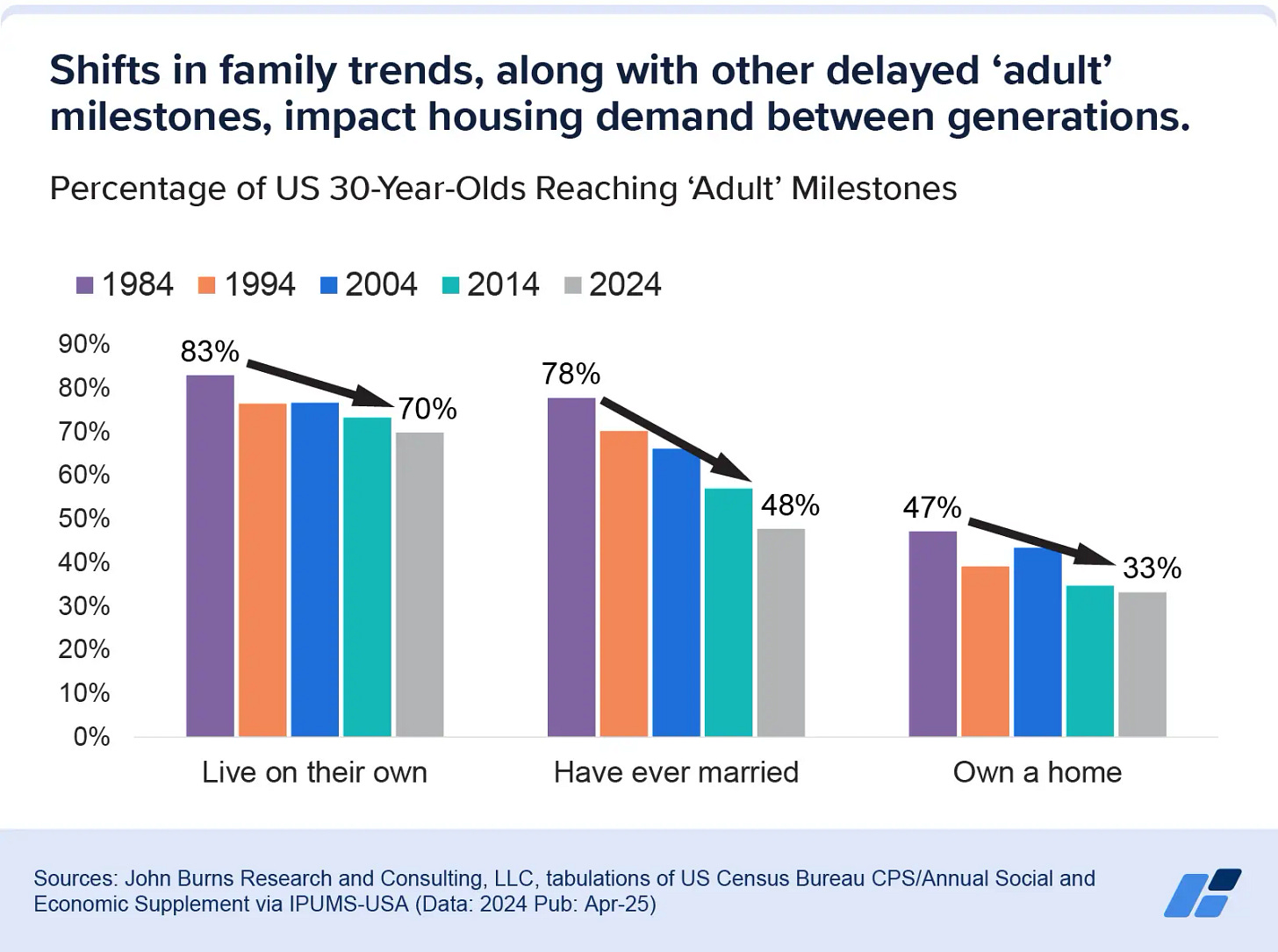 Compounding this is the fact that young, upwardly-mobile adults have been largely boxed out of the housing market. In 2025, the median age of a US homebuyer was 56 years old, up from 31 in 1981. And from July 2023 to June 2024, people between the ages of 26 and 44 accounted for only 29% of all home purchases, compared to 42% for the Boomers. Indeed, fewer and fewer are reaching ‘adult’ milestones by the age of 30:
