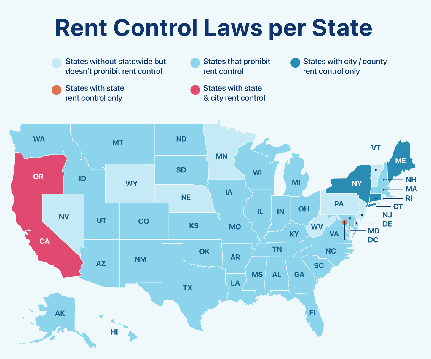 Additionally, 1 in 5 municipalities in New Jersey enforce local rent-control ordinances. Oregon and Maine also both have statewide rent‑control frameworks adopted in 2019 and 2023, respectively, that cap annual increases — Oregon: 7 % + CPI; Maine: municipal opt‑ins.