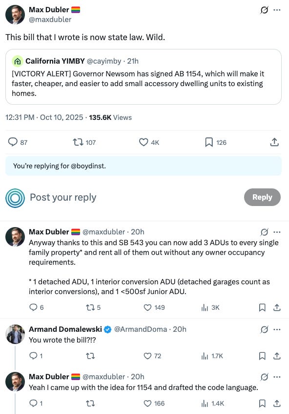It is our underlying and fundamental view that politics should not pre-empt policy; coalitions can be (and have been) built around well-crafted policy. In fact this seems, to us, to be one of the better ways to ultimately overcome partisanship (see: the success of the YIMBY movement and Abundance agenda). Lest we forget that SB 79 and the raft of pro-development legislation recently passed in Californa had (“micro”) blogger origins: