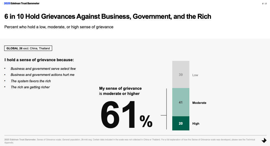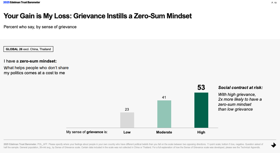 What has made such efforts possible in America was not coercion but legitimacy — consent of the governed and a shared belief that institutions and the state ought to operate with some meaningful level of autonomy. People once trusted that leaders and administrators purporting to be acting in the public interest were telling the truth. That trust made it politically feasible to move fast and take risks (and tolerate failure). But it has eroded meaningfully — trust is at an all-time low, grievances are high, and when people are agrieved they increasingly harbor a zero-sum mindset: