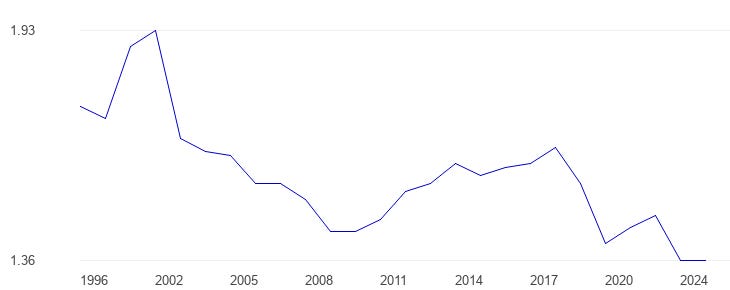 The World Bank’s Government Effectiveness index shows a United States in decline. In the early 2000s, the US scored 1.93, near the top of the world. By 2023 that figure had fallen to its lowest reading on record, 1.36.1