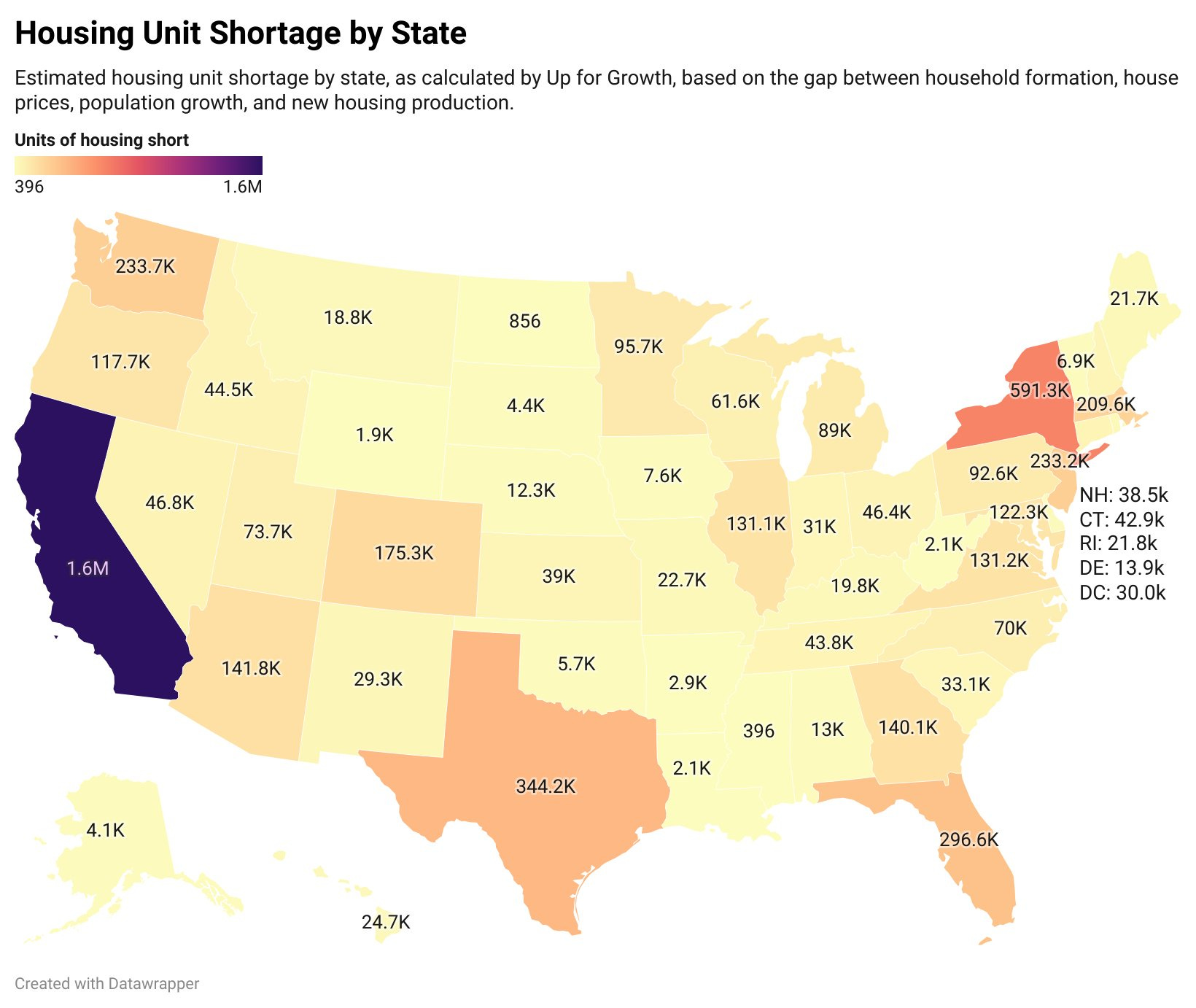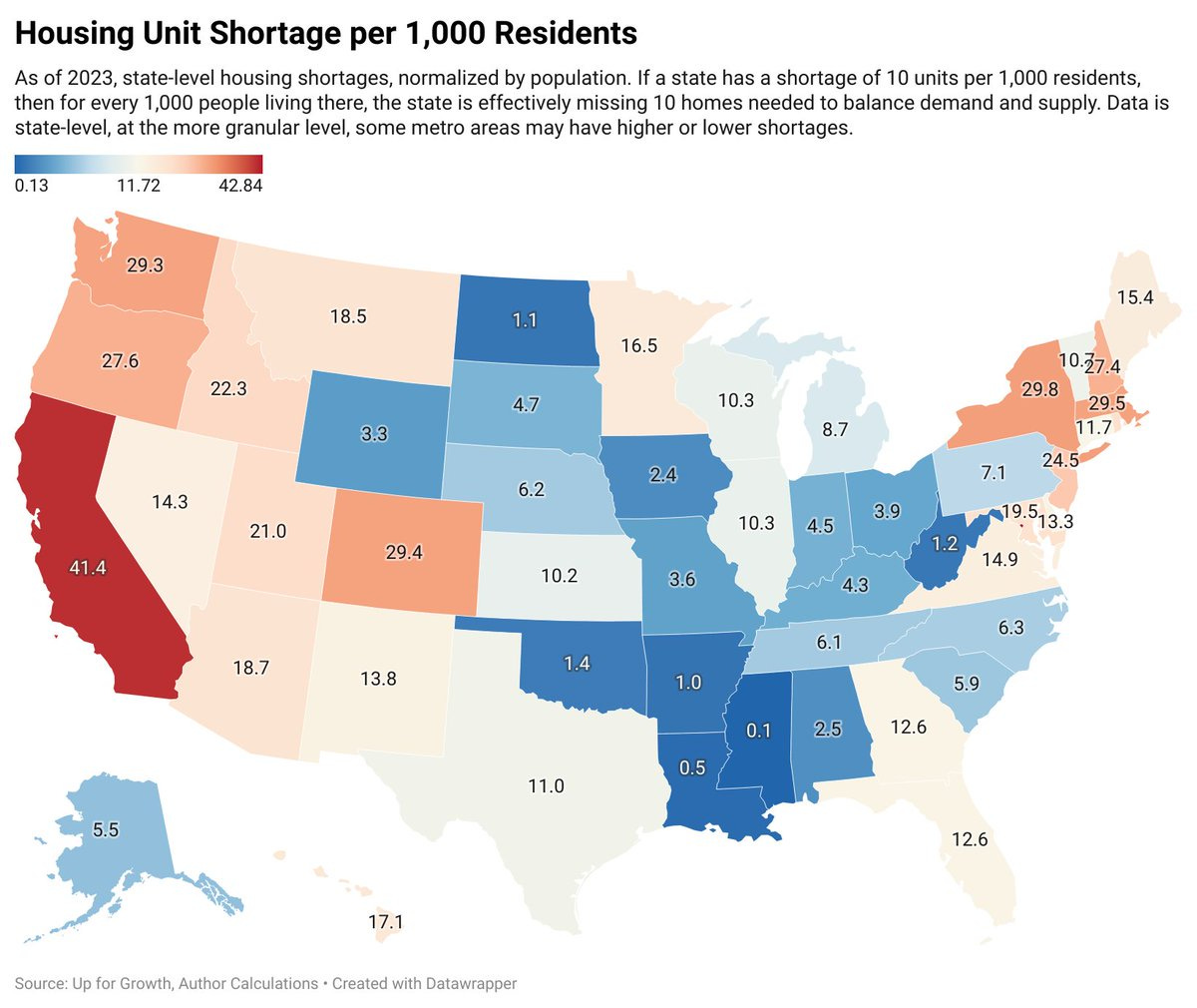This map of the estimated housing unit shortage by state, in absolute terms, had to be done in natural log form so as to accomodate the gulf between California’s shortage and the rest of the states’.