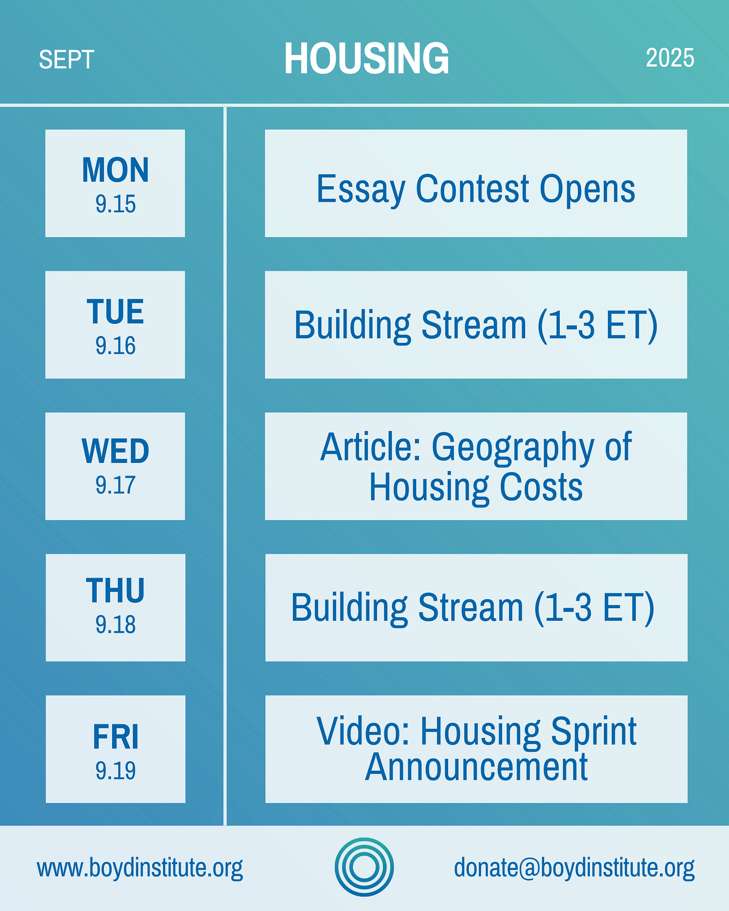 We’re hosting an essay contest! Contest opens September 15th. Prompt: “What’s an actionable, outside-the-box solution to America’s housing crisis?”