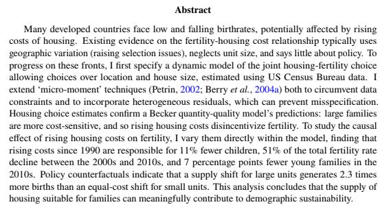 Couillard (2025), however, by explicitly modeling the joint decision problem using revealed preference data, suggests the above is necessary but insufficient — that the composition of supply matters enormously. Thus a policy that subsidizes construction of 1-bedroom units or relaxes zoning for apartments provides some affordability gain, but the fertility return is minimal because: