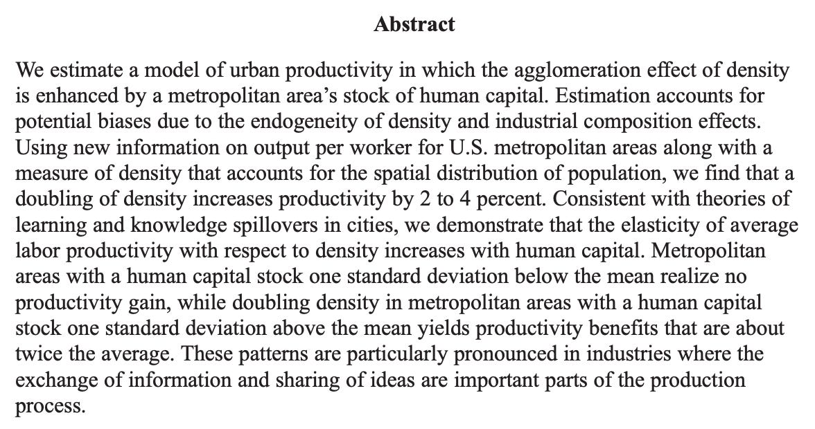 This study estimated a model of urban productivity establishing that density yields productivity gains, but the magnitude critically depends on a metro area’s human capital mix. The authors find that doubling density increases productivity by 2-4 percent overall, but this effect is highly conditional on skill levels. Notably, it found that metros with human capital one standard deviation below the mean realize essentially zero productivity gain from density increases, while those one standard deviation above the mean realize benefits ~2x the average. These patterns are most pronounced in industries where information exchange and idea-sharing are central to production.