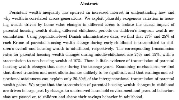 This paper shows that housing-wealth gains accruing to parents when children are 0–11 are causally transmitted at rates of 15–27% into the child’s adult wealth, while gains during the teen years have no measurable effect. What is even more interesting is that 60-80% of this wealth transmission operates through mechanisms beyond direct cash transfers — education, earnings, and household environmental effects from improved parental financial stability that all reshape children’s life trajectories.