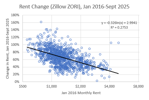 Rent in the most affordable ZIP codes has increased by about 50% more than rent in the most expensive ZIP codes. Think of it this way. Over the past decade, about one-quarter of the variance in rent has vanished. Another 3 decades like this, and every home in America would rent for $4,000 per month.