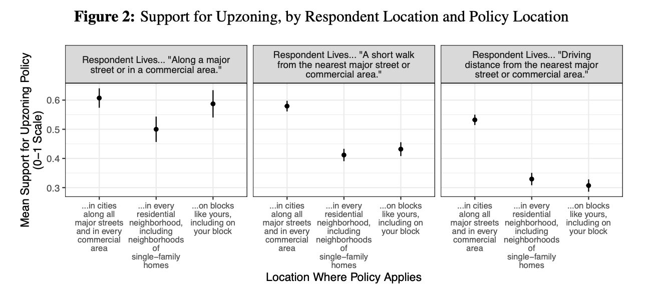 The paper’s results do in fact show that perhaps part of why single family homeowners oppose local density isn’t NIMBYism, but a widely shared view density should go in already-dense areas. Furthermore, its results confirm that both visual appeal and fit in context powerfully drive support for housing, and seemingly far more than affordability concerns. These judgments are sociotropic: voters didn’t just oppose ugly buildings on their own block; they opposed policies that would allow “ugly” buildings anywhere. That is, just as people support redistribution for the “greater good” they support aesthetic regulation for the “greater good”.