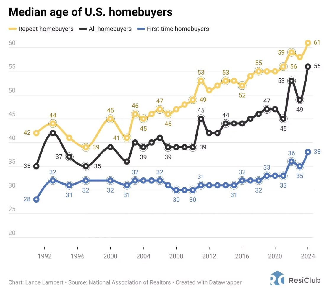 As a result, Boomers dominate demand – and supply – in the housing market today. Because they bought early and were often able to refinance with very low rates during ZIRP, many are able to use accumulated equity to outbid younger buyers. From July 2023 to June 2024 Boomers comprised 42% of all home purchases compared to only 29% for people between the ages of 26 and 44 . This is a radical departure from the late 20th century, for example in 1981, when the median age of a person buying a house was just 31 years old.
